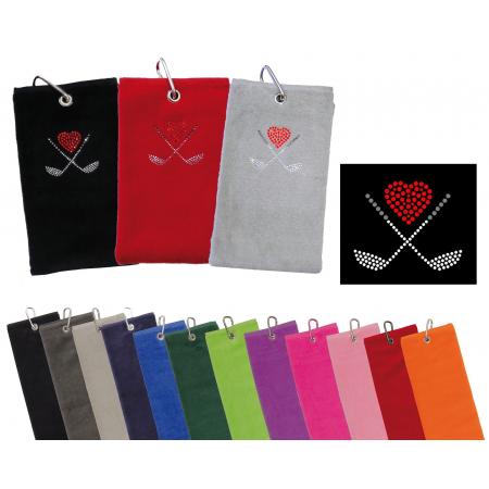 Hochwertiges Golftuch von cbfmoda aus hochwertigem Samtfrottier (100% Baumwoll-Velours, 500g/qm), verziert mit Motiven aus funkelnden Kristall-Elementen und/oder farbigen Metallsteinchen.