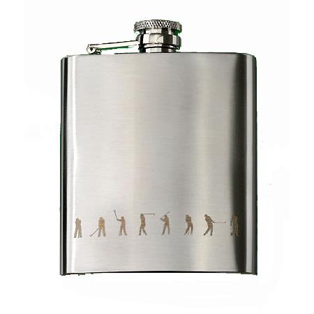 Flachmann aus Edelstahl mit lasergraviertem Golfmotiv.