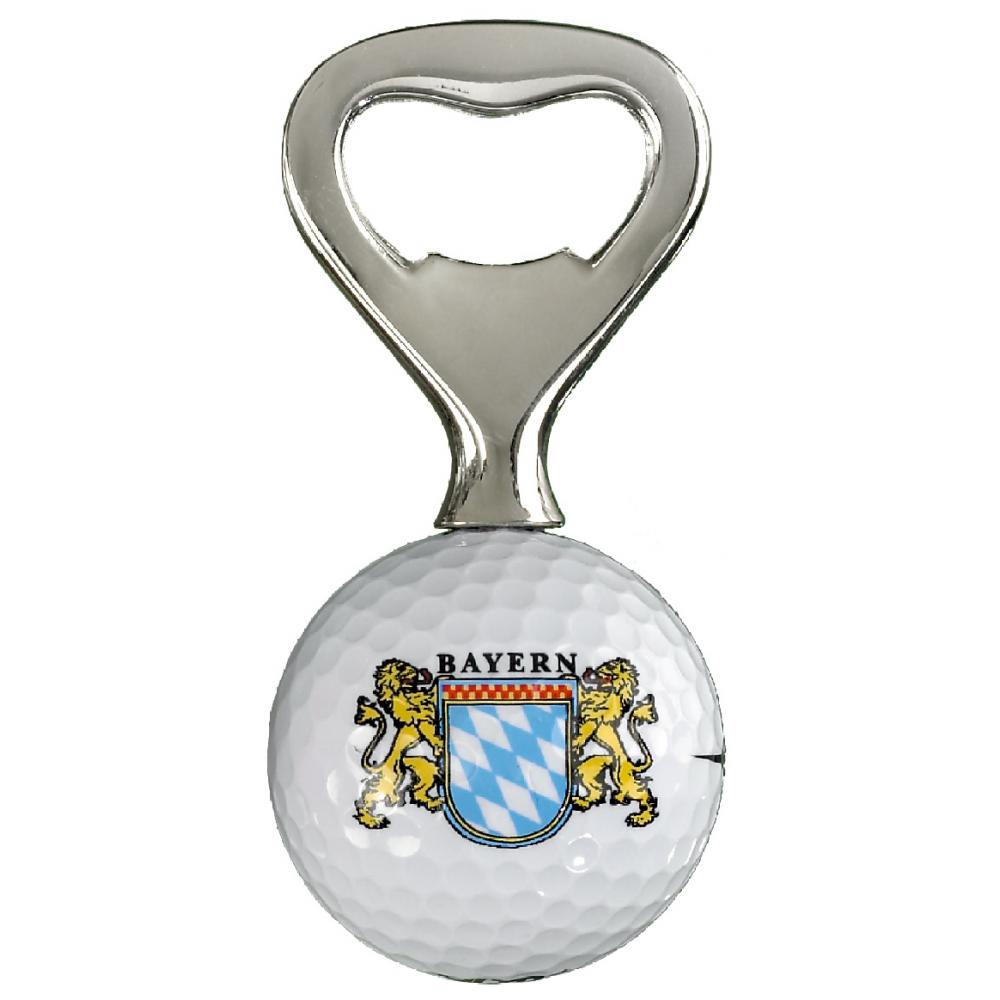 Flaschenöffner mit echtem, bedrucktem Golfball mit Bayern-Wappen.
