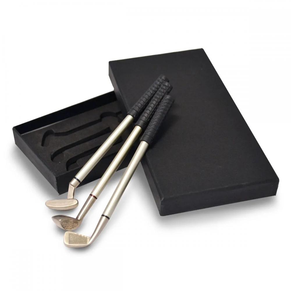 Drei Golfschläger als Kugelschreiber im Set . Je 1 Driver, Eisen und Putter mit verschiedenfarbigen Minen (Driver schreibt rot, Eisen schreibt schwarz, Putter schreibt blau).