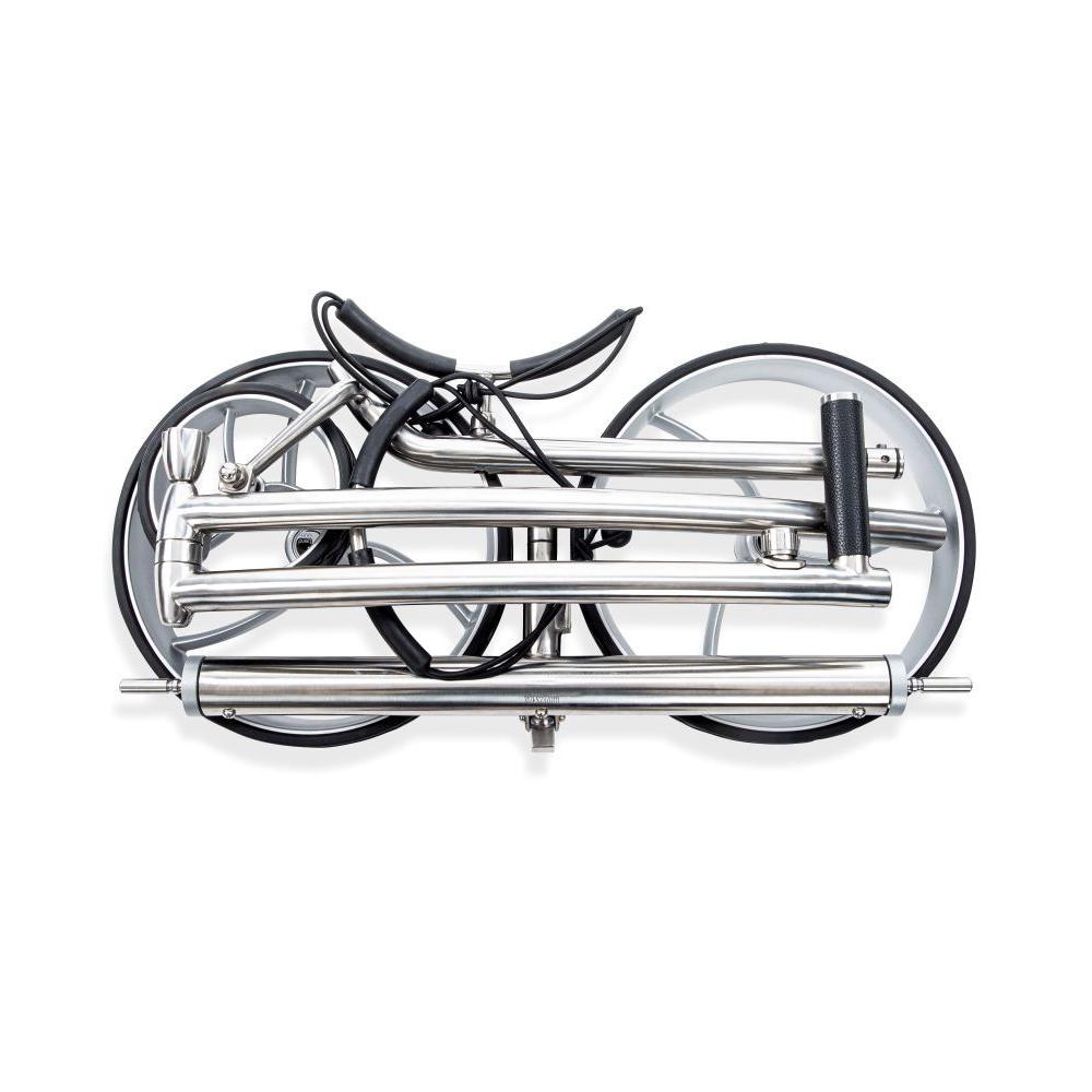 Der Rahmen des Trolleys besteht aus hochwertigem rostfreiem Edelstahl. Der trendGOLF. Streaker Elektrotrolley ist silberfarben poliert.